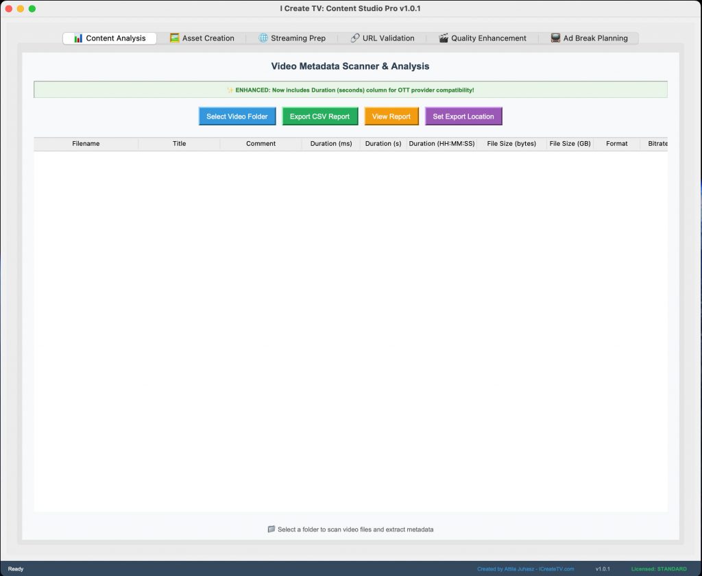 Extract detailed metadata from hundreds of videos in seconds. Professional broadcast-standard compliance checking, technical analysis (resolution, codecs, bitrates), and comprehensive CSV reporting for database integration. Perfect for content libraries and compliance verification.