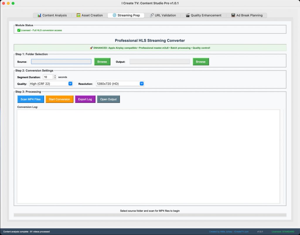 Convert your content to industry-standard HLS adaptive streaming format. Automatic multi-quality ladder generation (1080p, 720p, 480p) compatible with Netflix, Hulu, Amazon Prime workflow standards. Master M3U8 generation for instant OTT deployment.