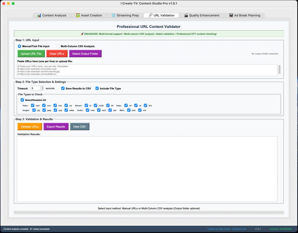 Bulk test hundreds of streaming URLs simultaneously. Verify CDN accessibility, detect broken links, monitor content availability, and generate detailed status reports. Essential for content distribution networks and platform management.